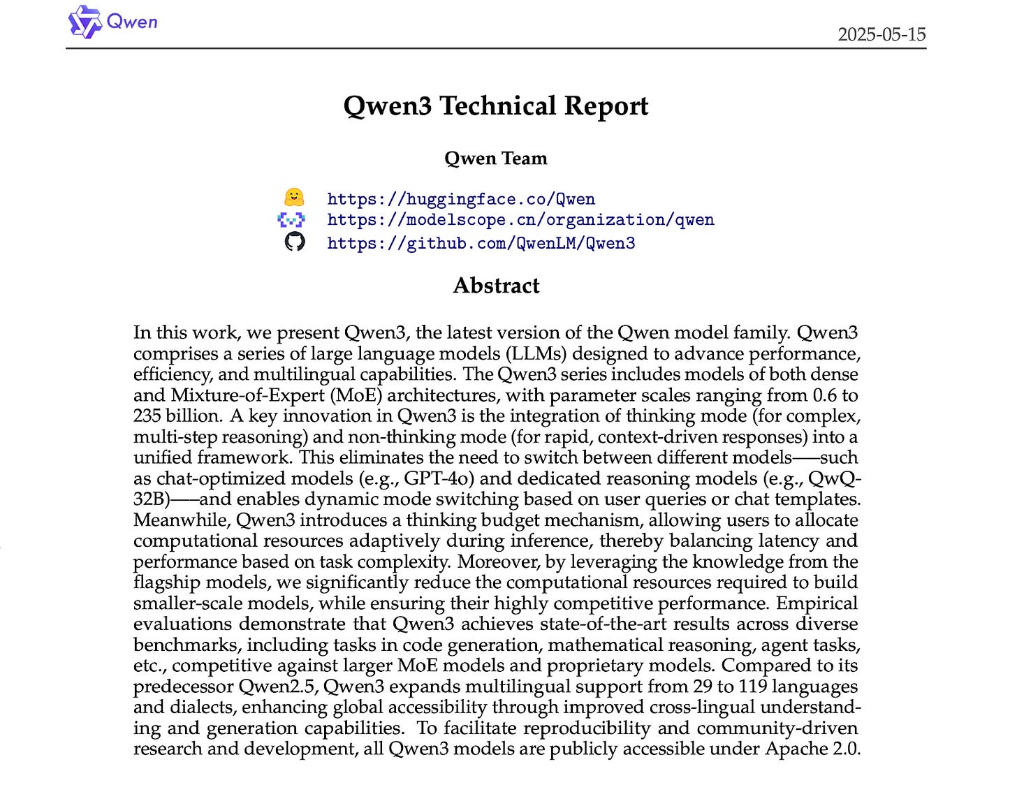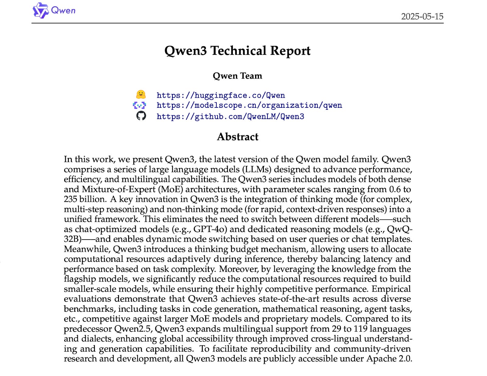 Three months later came Qwen3, its most ambitious LLM yet. Jack Ma, six years into retirement, was demanding regular progress reports from Zhou Jingren—a sign of how strategically important Qwen had become. The series spanned from 0.6B to 235B parameters, used an efficient Mixture-of-Experts design, and pushed hybrid reasoning into mainstream use. It excelled in math, coding, and multilingual reasoning across 119 languages, handled context windows of up to 128,000 tokens, and—critically—was released under the Apache 2.0 license.