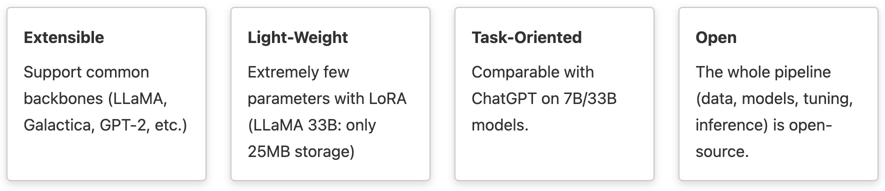 Features: LMFLOW boasts four key attributes: extensibility, lightweight design, task orientation, and openness.