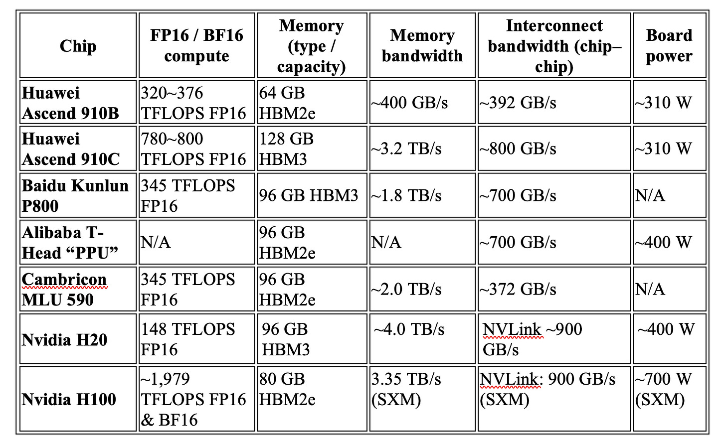 Still, a few contenders have emerged as China’s best hope: Huawei, Alibaba, Baidu, and Cambricon. Each tells a different story about China’s bid to reinvent its AI hardware stack. (Below is a chart comparing leading publicly available domestic AI chips with Nvidia’s H100 and H20.)